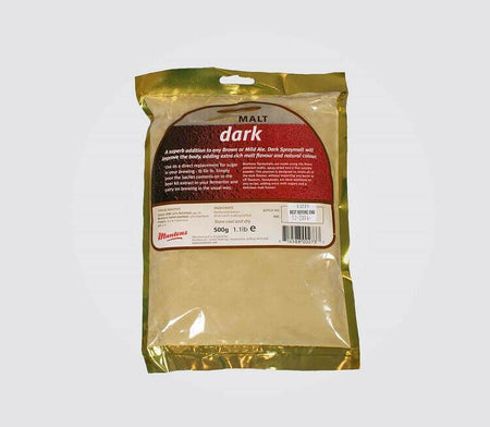 Muntons Dark Spraymalt 500g packaging for brewing with rich malt flavor and natural color.