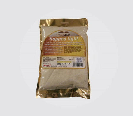 Muntons Hopped Light Spraymalt 500g packaging, ideal for enhancing beer kits and brewing recipes.